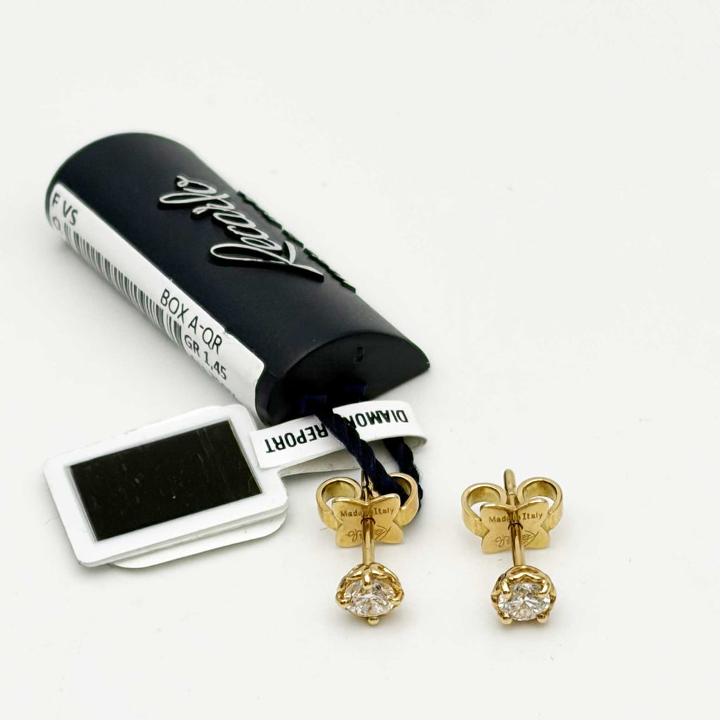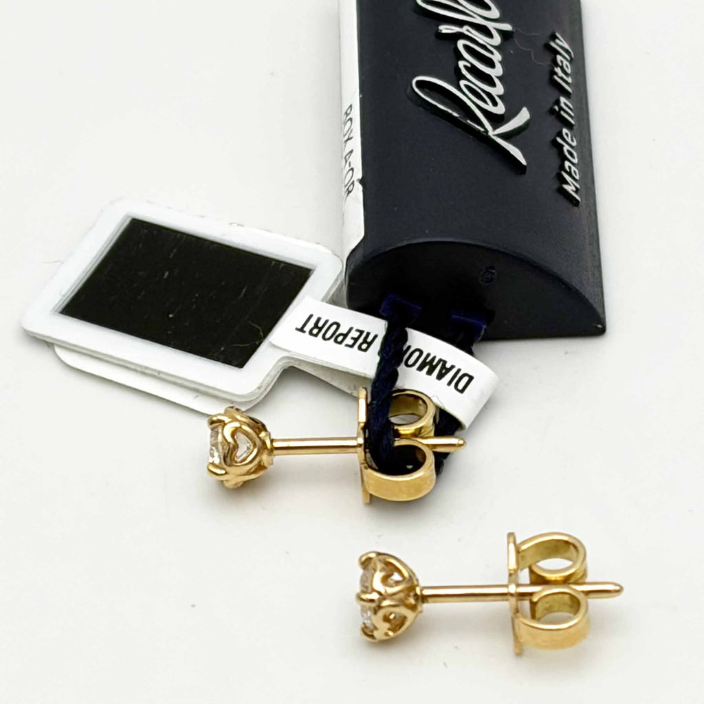 Collezione Anniversary, orecchini punto luce in oro giallo 18 Kt 1,45 gr. e diamanti taglio brillante 0,41 carati complessivi. Recarlo con le sue creazioni celebra le relazioni affettive attraverso un dialogo privilegiato per dare voce ai sentimenti e alle emozioni.  Un design originale, unico. La Collezione Anniversary si caratterizza per il dettaglio di piccoli cuori sui castoni dei diamanti. Il cuore simbolo universale di amore, incornicia il diamante esaltandone la brillantezza.