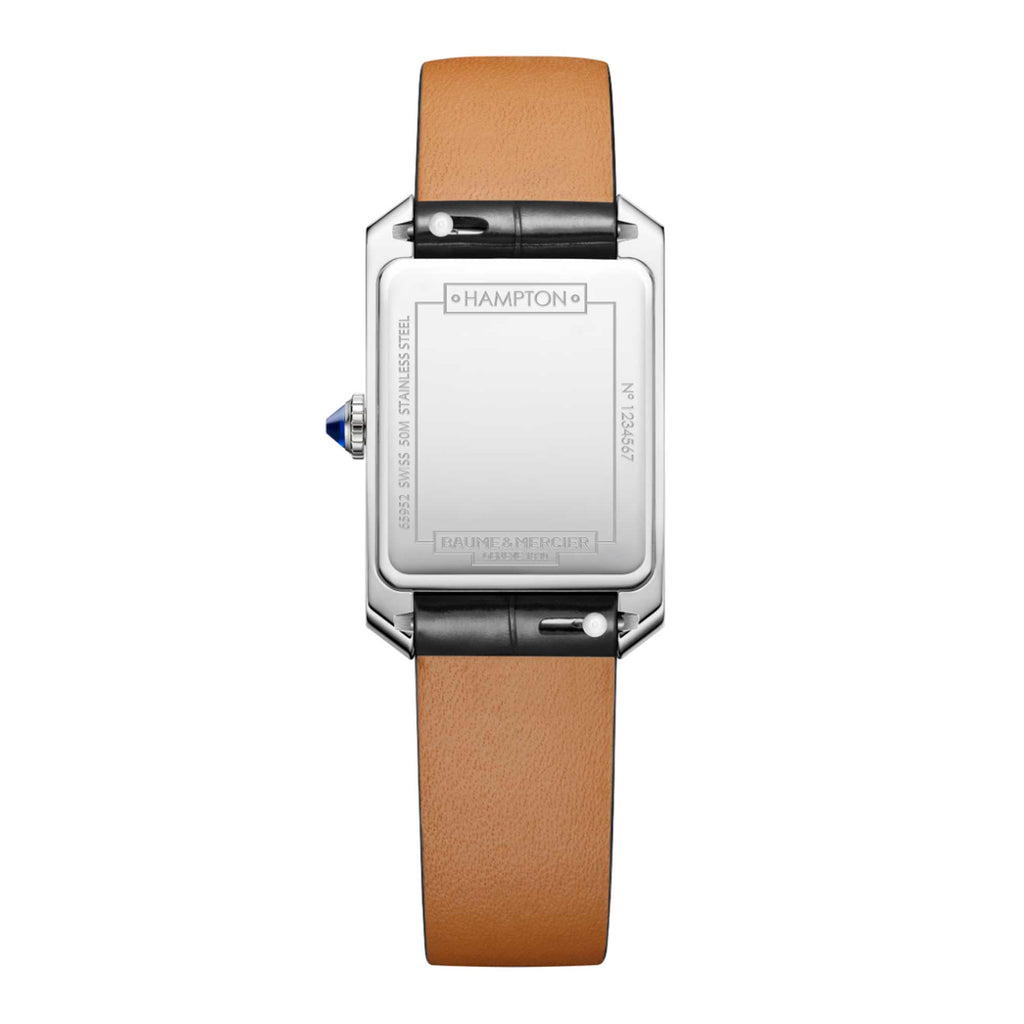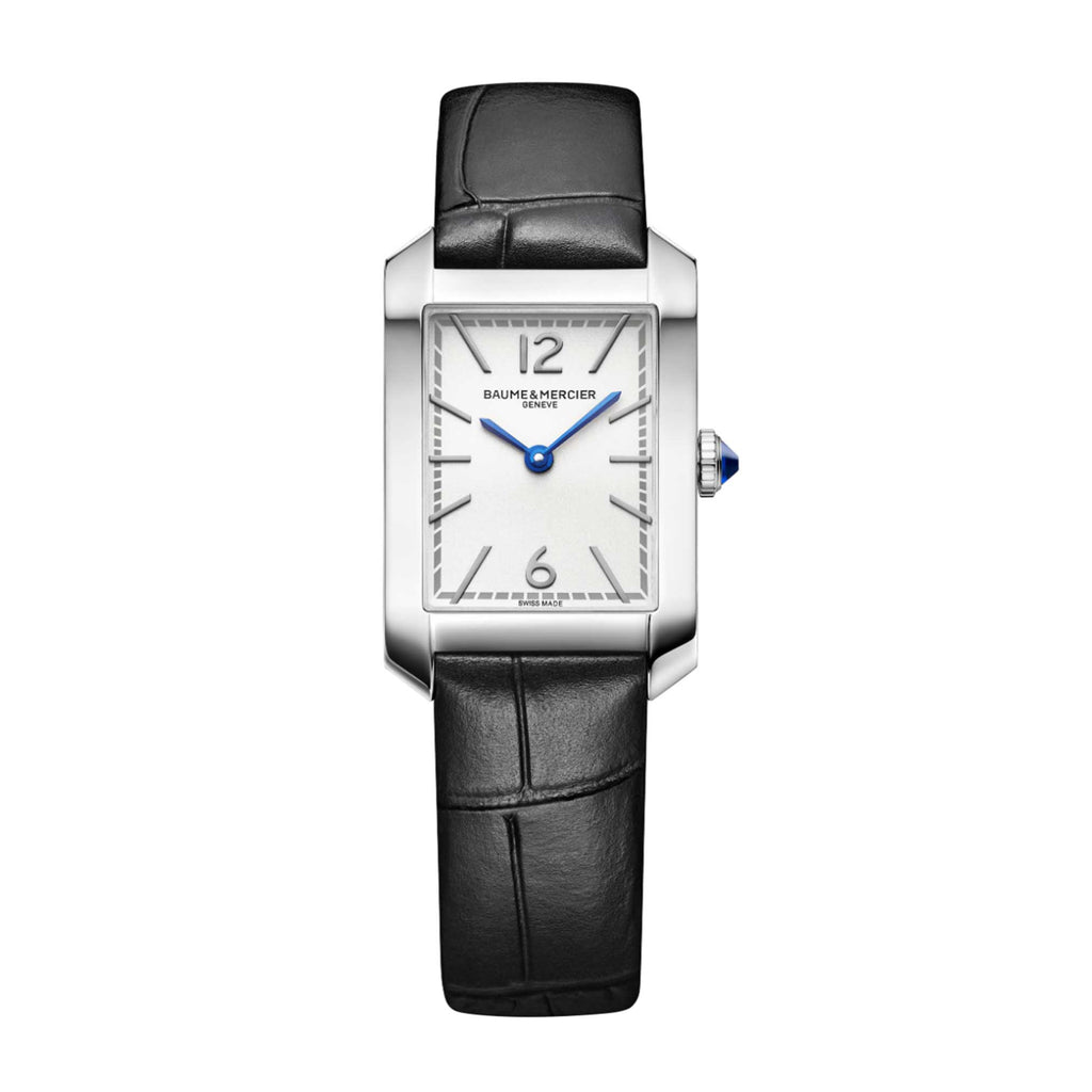 Il Baume & Mercier Hampton Quarzo 10759 è un elegante segnatempo rettangolare Swiss Made. Cassa in acciaio 35 × 22 mm, spessore ~6,9 mm, vetro zaffiro bombato, quadrante argento opalino con indici rivettati e lancette azzurrate a forma di gladio blu e minuteria grigia. Movimento quarzo Ronda/MHH057 con autonomia 8 anni, cinturino in pelle nera con fibbia ad ardiglione e impermeabilità 5 ATM