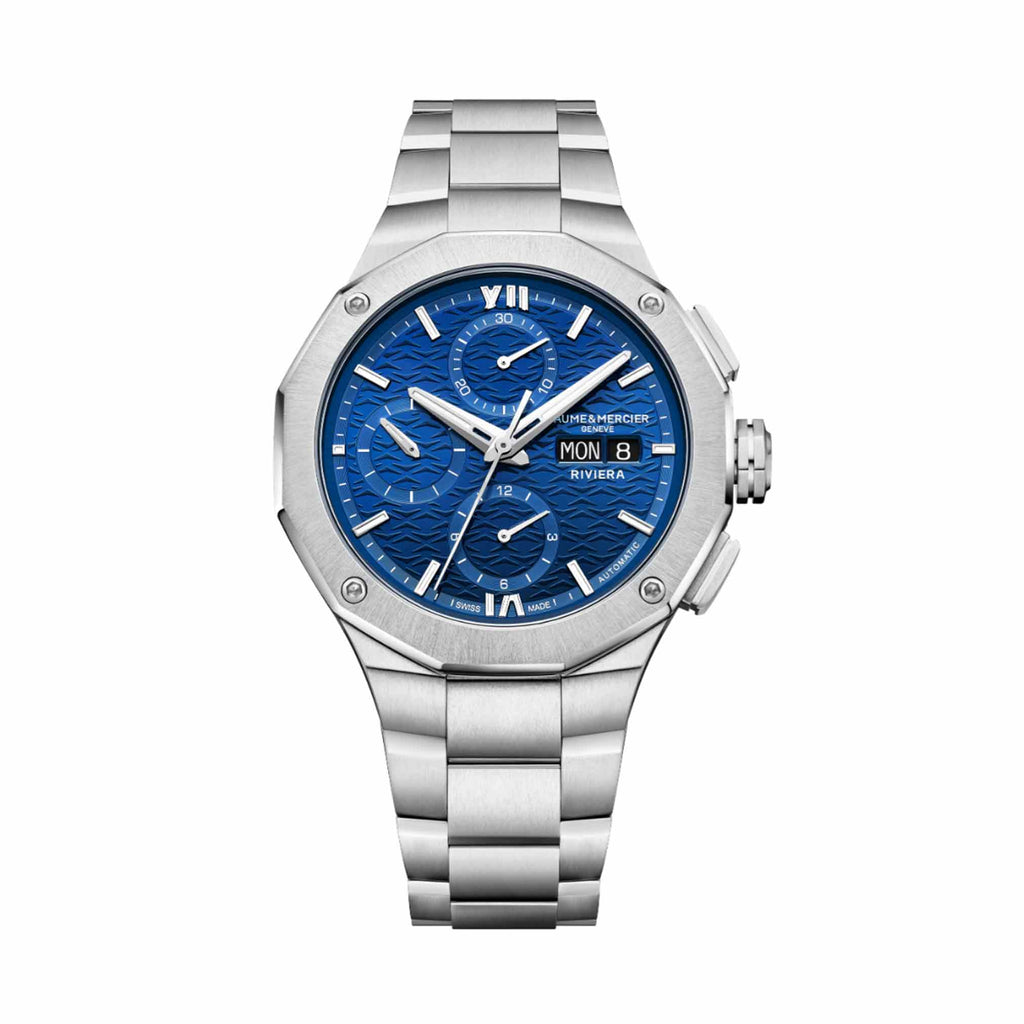 Il cronografo Riviera 10826, ispirato alla versione da 43 mm, si aggiunge alla collezione in un formato più sottile da 41 mm. La cassa dodecagonale in acciaio inossidabile lucido e satinato è protetta da un vetro zaffiro antiriflesso e il fondello a vista. Il quadrante blu sattiné con motivo a onde, piccoli secondi, minuti, ore, datario a finestrella, cronografo caratterizzato da un rehaut e da contatori azzurrati, mette in risalto i numeri romani, gli indici e le lancette rodiate con Superluminova bianco. È dotato di un movimento automatico con riserva di carica di 48 ore e impermeabilità fino a 10 ATM. Il bracciale intercambiabile in acciaio inossidabile è dotato di un affidabile sistema di sostituzione senza attrezzi.
