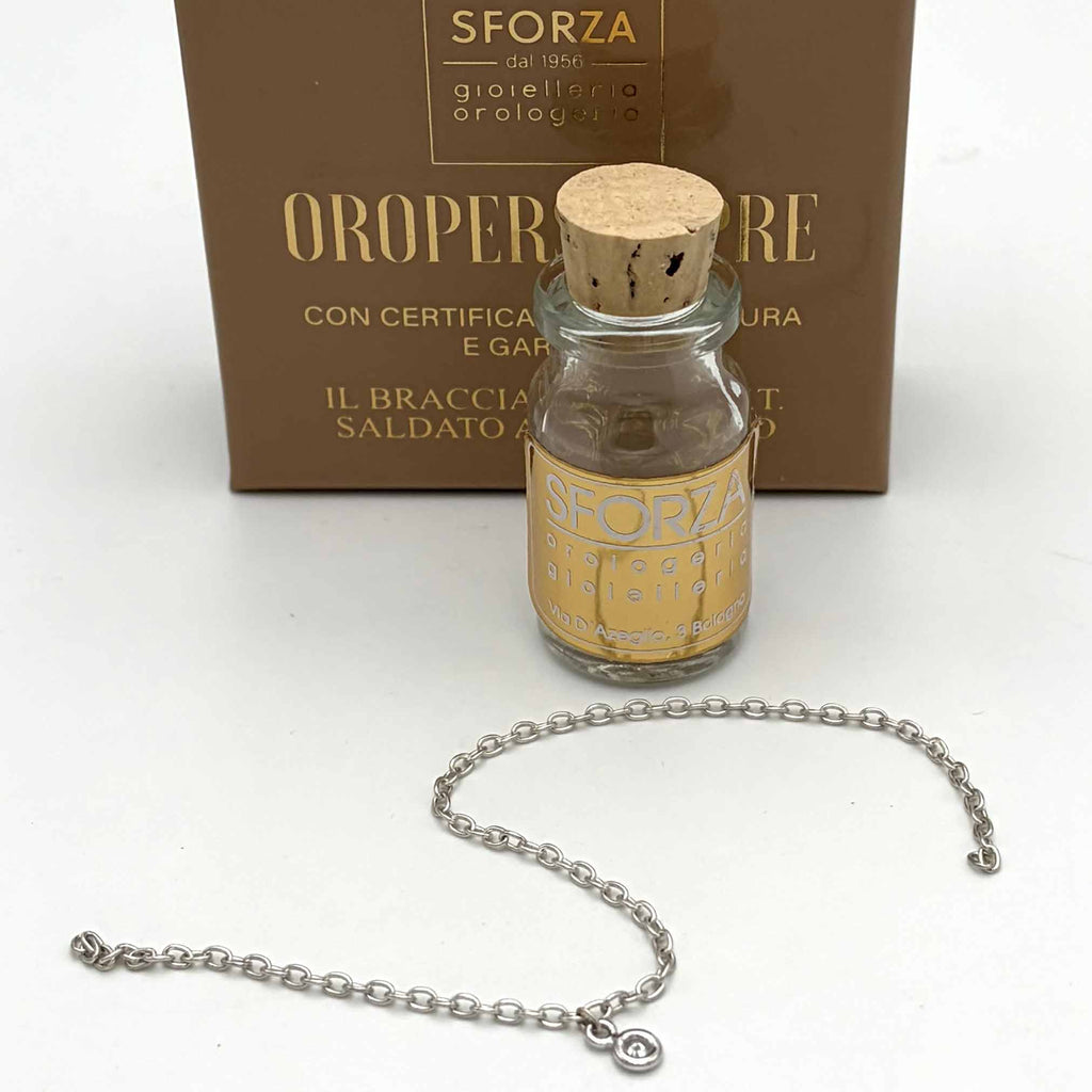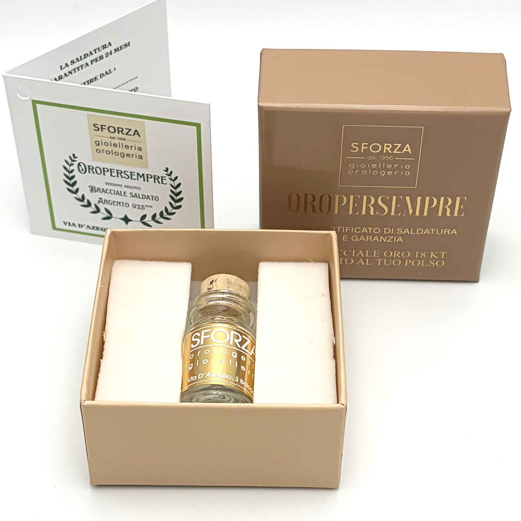 Il procedimento di saldatura è assolutamente innocuo, semplice e consiste nell'apertura di una maglia della catenella che viene poi richiusa con saldatura in maniera pulita e rapida. La saldatura viene effettuata con apposito strumento saldatrice ad arco voltaico utilizzata comunemente nei laboratori di gioielleria. Questo procedimento viene effettuato nella nostra Boutique SFORZA GIOIELLERIA di Bologna, in via D'Azeglio 3, a due passi da Piazza Maggiore. Nella confezione troverete il certificato di garanzia e saldatura che verrà datato al momento della saldatura.