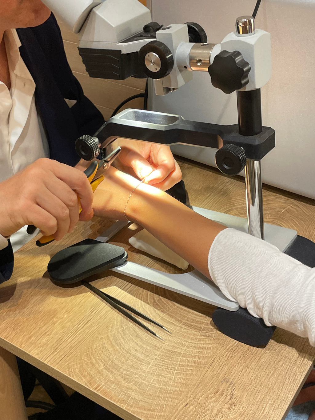 4)Colei che riceve il regalo verrà a Bologna, in pieno centro storico, presso la nostra Boutique SFORZA GIOIELLERIA e in pochi minuti il personale incaricato procederà senza alcune costo aggiuntivo a saldare al polso il bracciale, in maniera rapida pulita e assolutamente indolore.