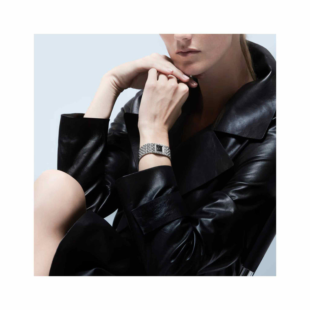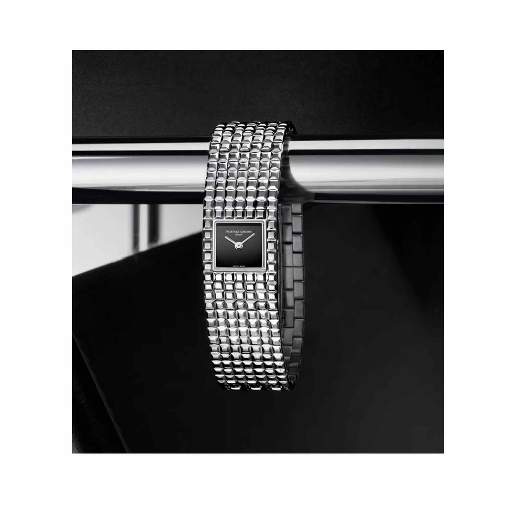 Il Frederique Constant FC-200ONB1MC6B è un orologio da donna che fonde eleganza e audacia. Il quadrante quadrato in onice nero è incorniciato da una cassa in acciaio inox lucido da 25,7 x 20 mm e uno spessore di 6,45 mm. Il bracciale a sette maglie presenta il motivo Clou de Paris, simbolo di raffinatezza. Il movimento al quarzo FC-200 (base Ronda 1032) garantisce una precisione affidabile e una durata della batteria fino a 60 mesi. Con una resistenza all'acqua di 3 ATM, è adatto per l'uso quotidiano. Orologio iconico di un’epoca che si permetteva di osare, incarna uno stile orologiero disinibito e libero.