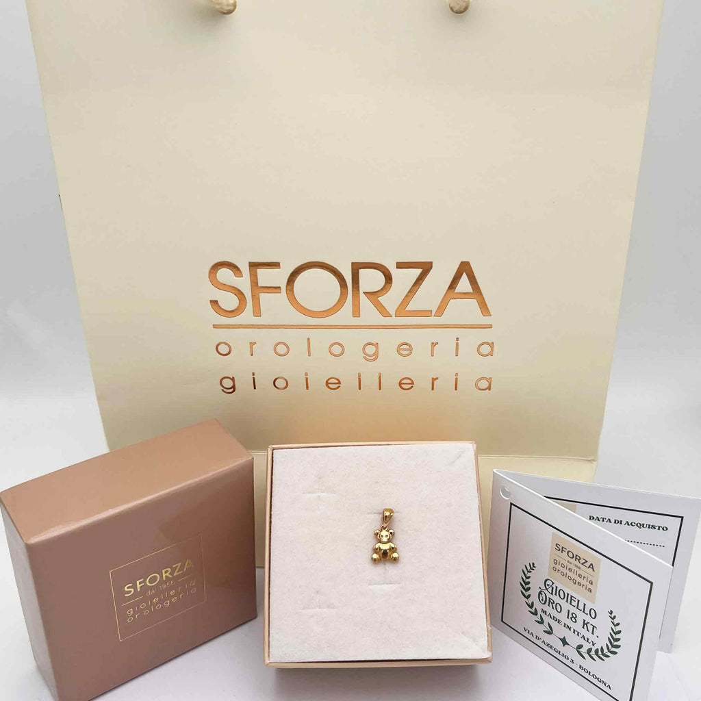 Immagina un piccolo orsetto, modellato in oro 18 kt, che sembra quasi voler uscire dal ciondolo per farsi coccolare. Le sue linee sono morbide e arrotondate, con zampette tonde. È un pendente che unisce dolcezza e raffinatezza: un compagno scintillante da portare sempre vicino al cuore.