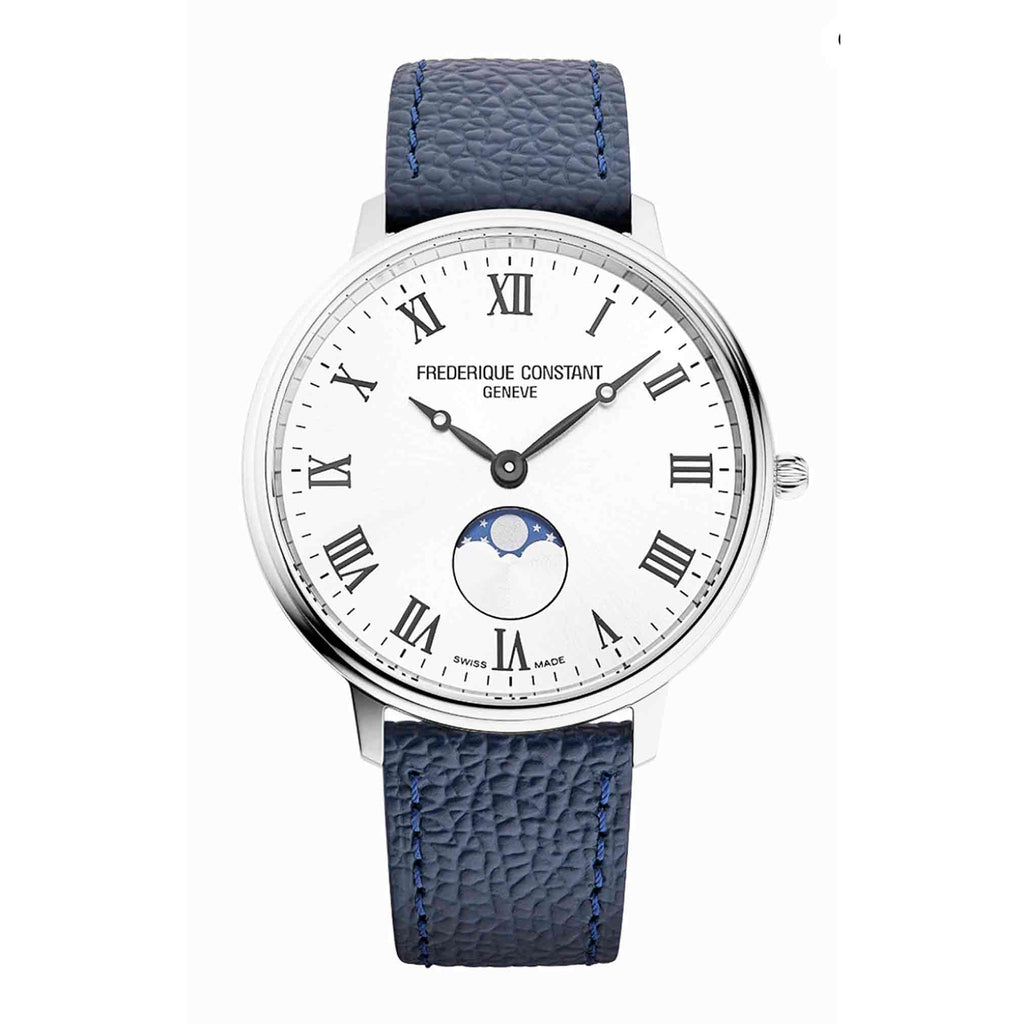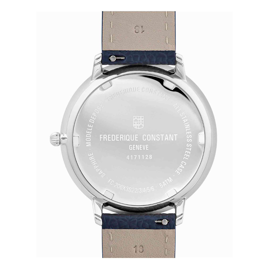 Il Frederique Constant Classics Quarzo Moonphase FC-206RS3S6 incarna l’eleganza svizzera in una veste raffinata e senza tempo. La cassa in acciaio inox lucido da 39 mm, sottile e armoniosa, custodisce un preciso movimento al quarzo FC-206 con indicazione di ore, minuti, secondi, data a lancetta e suggestiva funzione fasi lunari a ore 6.